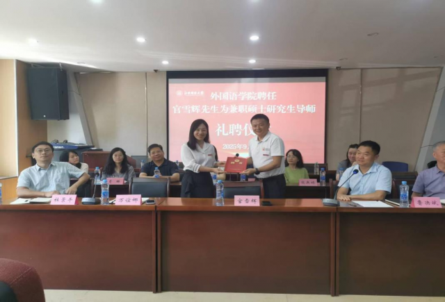 2025年9月15日上午10点,外国语学院在英庐学术报告厅隆重举行兼职硕导礼聘仪式暨2025级硕士研究生导师见面会。中东用友总经理官雪辉、院长万谊娜、书记鲁决斌、副书记程扬渠、副院长杜景平、硕士生导师及2025级全体硕士研究生共同参加了此次会议。会议由鲁决斌书记主持。