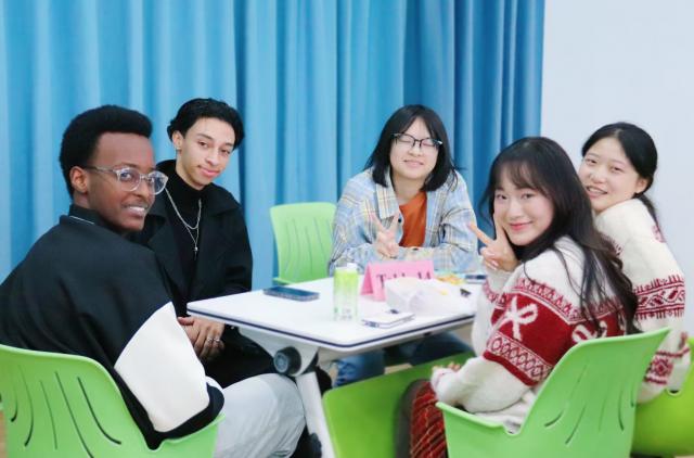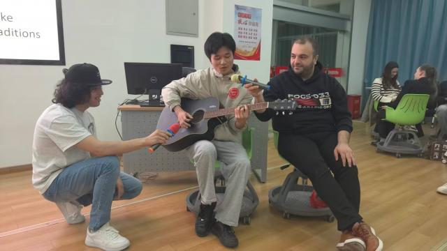 随后的自由圆桌交流,将夜晚推向高潮。围绕六个由浅入深的引导性问题,小组内的对话从美食的第一印象,深入到文化价值观的探讨。思想的火花在碰撞中迸发,此刻,我们不仅在对话,更在共同谱写一首关于理解与友谊的夜曲。从“你最难忘的一道菜”到“共享餐桌背后的文化意义”,话题层层深入,彼此的交流也渐渐走进心里。来自江西科技学院的中国学生陈兆康拿起吉他,美妙的阿拉伯歌曲为今晚的温暖交流增添了别样的风采。
