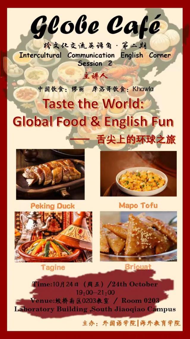 一缕茶香,可以飘过撒哈拉的风;一道辣味,能连接起东西方的胃。10月24日即上周五的夜晚,GlobeCafé第二期“世界美食之旅:中国与摩洛哥”如期而至。3名指导老师、36名学生志愿者、28名中国学子与来自摩洛哥、阿尔及利亚、几内亚、巴基斯坦、马达加斯加、俄罗斯、印度尼西亚、埃塞俄比亚、马里共和国、坦桑尼亚、柬埔寨、叙利亚、缅甸、孟加拉国、卢旺达等15个国家的36名留学生共103人,齐聚一堂,在一百二十分钟里,以美食为通用语言,进行了一场跨越山海的文化对话。
