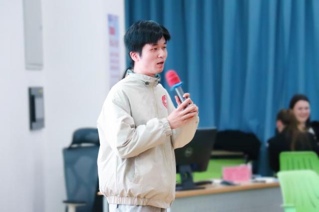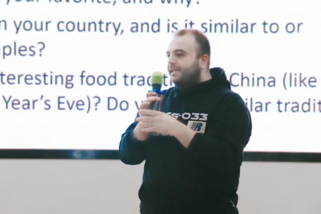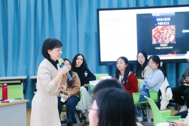 缪丽老师首先为我们带来了一场精彩的中国美食文化之旅。通过精美的PPT与短视频,她生动介绍了八大菜系的特色,更以“宫保鸡丁”的调和之道与“麻婆豆腐”的泼辣哲学为例,将中国菜背后的文化内涵娓娓道来。她强调:“在中国,美食不仅是味觉的享受,更是情感的纽带与文化的传承。”从菜系到故事,从味道到情感,缪老师让中国美食在世界的语境中焕发出新的生命力。现场提问环节同样气氛热烈,大家热情回应,纷纷讲述自己最喜爱的中国美食,积极发言的同学还收获了缪老师赠与的精美陶瓷茶杯与特色零食。