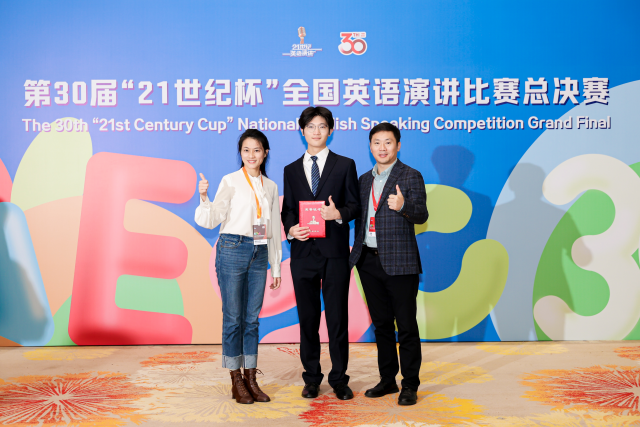 作为国内影响力最大、认可度最高的英语演讲赛事,本届比赛以“Living Within and Beyond the 21st Century”为主题,赛制全面升级、竞争空前激烈。沈宁粤一路经历校园选拔、区域赛突围、全国半决赛晋级,再到现场1V1即兴演讲、四分钟主题演讲、现场问答全流程对决。在强手如云的国赛舞台上,他凭借清晰的论证结构、强大的临场思维与沉着自信的台风,得到评委的一致认可,以绝对优势跻身全国一等奖领奖台。