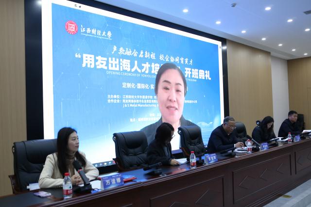 校党委常委、副校长阙善栋,用友中东网络科技有限公司总经理官雪辉,开点(香港)科技有限公司人力资源经理黄媛媛,用友新道江西分公司总经理丁立波、服务总监彭佳琦,学校教务处、研究生院、国际合作与交流处、国内合作处、校友联络服务中心、海外教育学院等部门相关领导,合作企业代表、外国语学院党政班子成员、来自中国、摩洛哥、尼日利亚、加蓬等11个“一带一路”共建国家的培优班全体中外学员、学院本硕学生代表以及项目组全体工作人员齐聚一堂,共同见证项目启航。典礼由外国语学院院长万谊娜主持。