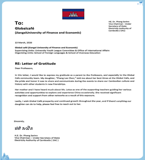 柬埔寨电力总局(EAC)副主席PhangSarinn博士发来感谢信及赠送柬埔寨吴哥窟特色木雕,对我校GlobeCafé平台为其女儿PhangLee Chen(25级国际商务硕士生)提供的文化交流机会表示诚挚谢意,并盛赞GlobeCafé的国际文化交流价值。有位外省同学坦言有时自觉和留学生一样有漂泊他乡之感,甚是孤独,但参加完活动后心情舒畅,期盼下期早日到来。华东交通大学师生、南昌五中国际部学生、南昌工程学院留学生等校外人士也纷纷慕名而来,这个跨文化大家庭正吸引着越来越多元的参与者。