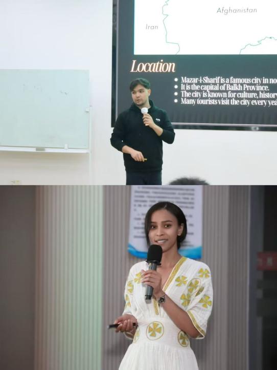 在第10、11期活动中,来自阿富汗的Baset带领大家走进马扎里沙里夫市的千年沧桑与阿富汗的市井烟火;来自埃塞俄比亚的Betti分享了故乡的古老岩石教堂与闻名世界的咖啡仪式;身着传统服饰的摩洛哥女孩AsameGharafi分享了她逐梦江财的收获和喜悦,并与观众共舞摩洛哥独特舞蹈;中国学子黄敏茜则以音乐为媒,带动全场数着节拍,让交流在音符间自然流淌。四国文化同台绽放,让中外学生在沉浸式体验中学会尊重差异、欣赏多元,这正是“全球胜任力”最生动的课堂。